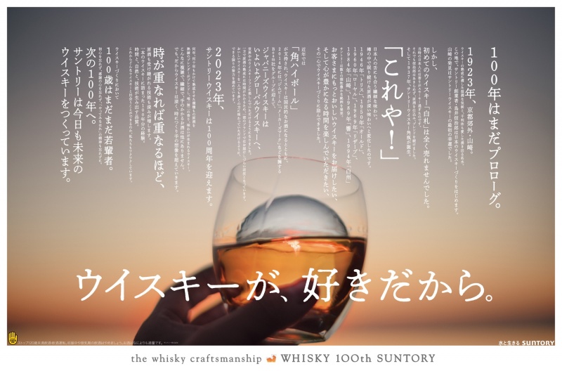 the whisky craftsmanship 100th WHISKY SUNTORY サントリーウイスキー100周年の新聞広告を撮影しました。「100年はまだプロローグ。」というコピーにサントリーの掲げる道筋がみえます。時が味わいや深みにもなるウイスキー。太陽ののぼりはじめの美しい朝日を、琥珀色のウイスキーごしに撮影しました。寒い冬の早朝、キーンとする空気の中、海を望むロケーションでの撮影となりました。I shot the newspaper ads for Suntory’s 100th anniversary of whisky making: “the whisky craftsmanship—100th WHISKY SUNTORY” Suntory reveals the path forward it has set out in the advertising copy “Hyakunen wa mada prologue.” (“The first 100 years were just the prologue.”) With whisky, time turns into flavor and also depth. I photographed the beautiful morning sun, about to rise behind amber whisky. I shot it at a location overlooking the sea in crisp air early on a cold winter morning.