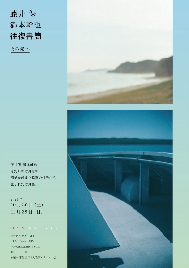 『藤井保 瀧本幹也 往復書簡 その先へ』を開催いたします。 2019年6月からMA2 galleryの発案で、師弟関係にある藤井保と瀧本幹也による、写真を交えた電子メールの往復書簡が始まりました。そのやりとりは2年半にも及び、その間様々な環境の変化が起こり、その中での意見や想いが、これまでじっくりと交わされてきました。激動の社会情勢に直面しながらも、真摯に写真と向きあい往復書簡は粛々と続けられてきました。今回の展示では、その往復書簡をベースにふたりの写真が静かに呼応し合う内容をご覧いただけます。1階では、過酷な大自然の環境で捉えられた作品が展示されます。2階に上がると、藤井と瀧本の今だからこそ伝えたいメッセージ写真が繰り広げられます。そして、3,4階ではこの展覧会のために、ふたりが選んだポラロイドをひとつのフレームの中に組み合せた作品と、往復書簡のやり取りから生まれた、ふたりの組み写真で構成されます。ふたりが出会って29年、ここに師弟を超えた写真展がうまれました。2021年10月30日(土)〜11月28日(日) MA2 Gallery 東京都渋谷区恵比寿3-3-8 Open 水〜日(火曜のみアポイント制) 13:00〜19:00 We are holding the exhibition “Tamotsu Fujii, Mikiya Takimoto, Ofukushokan, Sono Saki e” (“Tamotsu Fujii, Mikiya Takimoto, Correspondence, and Beyond”). Following a suggestion by MA2 Gallery, Tamotsu Fujii and Mikiya Takimoto, teacher and student, began corresponding and sharing photographs by email in June 2019. The correspondence lasted two and a half years as they shared at length their opinions and thoughts in response to each other, while various changes went on around them. Although faced with a tumultuous social situation, they went about their photography seriously and managed to quietly continue corresponding. This exhibition makes accessible to viewers the unruffled photographic responses to one another emanating from their correspondence. Exhibited on the first floor are works captured amid harsh natural environments. Spread out on the second floor are photographs carrying messages Fujii and Takimoto are intent on making, all the more so given the current times. On display on the third and fourth floors are works created by combining Polaroid photos selected by the two artists into single frames, as well as photographic montages by the two emanating out of the exchanges in their correspondence, especially for this exhibition. Twenty-nine years since the two met, here is a photography exhibition that goes beyond the teacher-student relationship. October 30 (Sat) to November 28 (Sun), 2021. MA2 Gallery, 3-3-8 Ebisu, Shibuya-ku, Tokyo. Open Wed to Sun (Tue by appointment only) 13:00 to 19:00.
