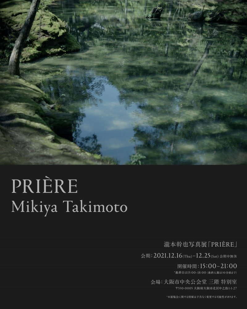 大阪市中央公会堂 特別室での展示を依頼された事により端を発し、新たな作品が出来上がりました。2020年、京都・妙満寺で開催された写真展『CHAOS 2020』。人智の及ばない大自然をとらえた作品群の中に、南極大陸で撮影された7連作品がありました。そこに添えられた1点の菜の花の写真。その存在が示唆したのは、厳しい冬の先にある春を見つめる写真家のまなざしでした。希望の光に祈りをこめた作品の数々が並びます。祈りを表す作品に、重要文化財である特別室という部屋との調和もあり、内面に引き込まれていく感覚をおぼえます。コロナ禍における写真の在り方を問い続けてきた瀧本幹也による新作を、是非ご覧ください。2021年12月16日(木)〜12月25日(土) 大阪市中央公会堂 3階 特別室 大阪府大阪市北区中之島1-1-27 15:00~21:00(最終日は18:00迄) 最終入館は30分前迄 会期中無休Newly completed is a work stemming from a request to put on an exhibition in the Special Room at Osaka City Central Public Hall. CHAOS is a photography exhibition held at Myomanji Temple, Kyoto in 2020. Among the works capturing nature beyond human understanding, were seven consecutive photos shot on the Antarctic continent. And along with them, a single photo of rape blossoms at the end. Its inclusion suggests a vision of spring after a harsh winter, through the eyes of the photographer. The exhibition includes numerous works carrying prayers in the light of hope. These works, these expressions of prayer, harmonize with the Special Room, itself an Important Cultural Property, and give you a sense of being drawn into yourself. Please come and see these new works by Mikiya Takimoto, a photographer who has continued to interrogate approaches to photography in the pandemic. December 16 (Thu) to 25 (Sat), 2021 Special Room, 3F Osaka City Central Public Hall. 1-1-27 Nakanoshima, Kita-ku, Osaka-shi, Osaka 15:00-21:00 (Closes at 18:00 on the final day) Last admission 30 min before closing. Open every day of the exhibition.