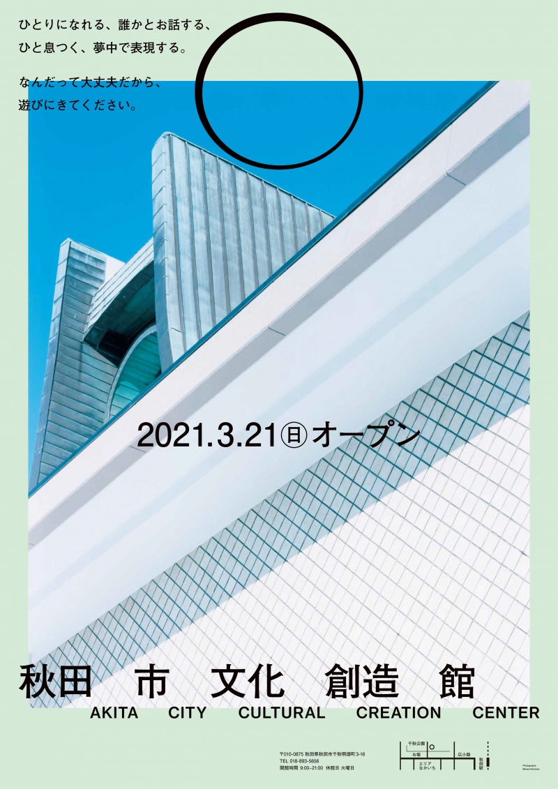 2021年3月21日秋田市文化創造館が新しい文化施設として開館しました。ポスターに使用されますメインビジュアル、また開館に合わせて作成されました秋田市文化創造館 記念本の撮影も行いました。秋田市文化創造館の特徴的な屋根にある丸窓、2階ホールにある曲げわっぱの天井など館内外の様々な表情が撮影できました。冬は曇りや雪が多くなかなか晴れ間が見えづらい時期ではありましたが、大雪が降った数日後の撮影にも関わらず天候に恵まれるタイミングがあり快晴の中での撮影もできました。Akita City Cultural Creation Center opened as a new cultural center on March 21, 2021. We photographed the main visuals used in the posters and the commemorative book produced to mark the opening of the Akita City Cultural Creation Center. We captured a number of the Center’s characteristic features, both external and internal, like the round windows on its roof and the magewappa (bentwood) ceiling in the second-floor hall. Winter in Akita is cloudy or it’s snowing most of the time, so you don’t get much clear weather, but our timing was good, we were fortunate to get some good weather and shot the photographs under clear skies, even though it was a few days after a heavy snowfall.