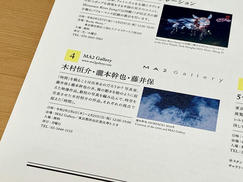第12回 恵比寿映像祭 MA2Gallery(恵比寿)にて開催の地域連携プログラムに参加。木村恒介・瀧本幹也・藤井保 「時間」を視ることはできるだろうか? 藤井保の「人為・静」、瀧本幹也の「自然・動」2人の個性がコントラストを際立たせる、写真家による映像作品。写真を使い、時空が交差する作品を制作する現代美術家の木村恒介。捉えられた「時間」から広がる私たちの想像。日時: 2020年2月6日(木)〜2月23日(日・祝)会場: MA2 Gallery 東京都渋谷区恵比寿3-3-8 入場: 無料 休日: 月曜日 TEL : 03-3444-1133 展示機材協力:キヤノンマーケティングジャパン株式会社I’m participating in the regional cooperation program held in the MA2 Gallery in Ebisu, as part of the Yebisu International Festival for Art & Alternative Visions 2020. A joint exhibition by KIMURA Kohsuke, myself, and FUJII Tamotsu, we ask the question, “Is it possible to see time?” Fujii and I, the two photographers, are both exhibiting video installations — the “artificial & static” nature of Fujii’s work providing a sharp contrast with the “nature & motion” of my own. Kimura, a contemporary artist, has used photographs to create works where space and time intersect. Perhaps our interpretation of time will spark the imagination of viewers. Dates: Feb. 6 (Thu) – Feb. 23 (Sun/public holiday) 2020; Venue: MA2 Gallery, 3-3-8 Ebisu, Shibuya-ku, Tokyo; Entry: Free entry; Closed: Mondays; Tel.: 03-3444-1133; Display Materials Assistance: Canon Marketing Japan Inc.