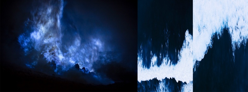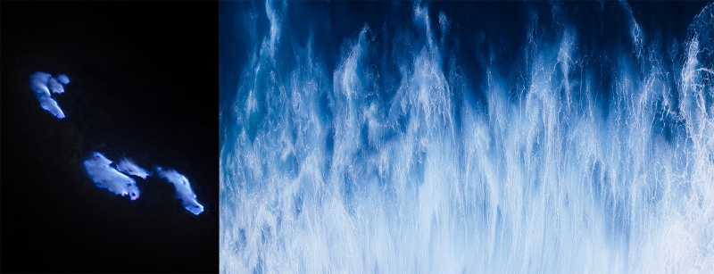 The 2011 photograph collection, “LAND SPACE” consisted of two contrasting series; “LAND” visualized what the earth might have been like long before the birth of life, and “SPACE” captured space development as a symbol of the cutting edge of human civilization. The former showed volcanic craters, which spew energy from the depths of the earth, and the landforms of our primordial planet. In contrast, the latter showed the manmade injection port of a rocket engine, which struggles against resisting forces in an effort to escape into space, and heat-resistant panels that protect against high temperatures upon reentry. I noticed that the traces borne by both subject matters are intriguingly similar. Following the photobook, “GRAIN OF LIGHT” addressed the ocean, which envelopes the earth’s surface. In that project, I became absorbed in the continual ebb and flow of time. “FLAME/SURFACE” marks a further evolution along the path. “FLAME” portrays the phenomenon of eerie blue light that occurs when the incredible energy of volcanic gas eventually rises from the earth’s interior below the equator and ignites on the surface. This struck me as similar in appearance to a distant nebula. “SURFACE” examines the planetary phenomenon of water. How does it look without preconceptions when the viewpoint is switched to a distance from earth? Such musings have led me to believe that fixing the up and down of sea photography is merely arbitrary. The earth’s activities are cyclical. As I released the camera’s shutter along with those rhythms, I experienced a feeling I can only describe as long, cosmic time. Mikiya Takimoto