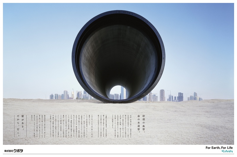 取水地や海からの命を支える水を運ぶKubotaの水道管を撮影してきました。1本9メートルの水道管が人々の日々の生活を支える。街を少し離れると砂漠のような光景が広がる。街がオアシスのように見えるのは命を支える水が安定的に供給される環境もその一助を担う。大きな水道管を覗き込むようなアングルは、街を目指す水の目線のようでもある。Takimoto Photographs Kubota’s Pipes for Newspaper Ad. Takimoto photographed water pipes that Kubota uses to transport water from the sea and other water sources. Nine-meter water pipes contribute to people’s daily living, but the landscape is like a desert only a short distance from town. An environment with a stable supply of water, a prime support for life, helps give the town the character of an oasis. Peering down a large pipe at a certain angle is like looking from the viewpoint of water as it flows toward town.